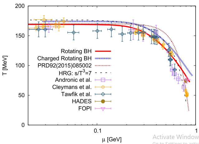 The proposed correspondence between the Hawking-Unruh radiation mechanism in rotating, electrically-charged, and electrically-charged-rotating black holes and the hadronization process in high-energy collisions is assumed here. This allows us to determine the well-profound freezeout parameters characterizing the heavy-ion collisions. Furthermore, black holes thermodynamics is found analogous to a to that of the high-energy collisions. We also introduce a relation expressing the dependence of the angular momentum and the angular velocity deduced from rotating black holes on the chemical