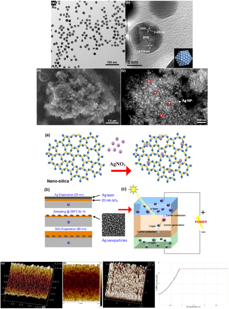 A highly efficient photovoltaic nanocomposite device is demonstrated by fabrication of structural clusters of silver nanoparticles (Ag NPs) on silicon solar cells via a boil deposition method. The efficiency of silicon solar cell was augmented by coating Ag NPs ultra-thin-film deposition on silicon solar cell. Chemically synthesized silver NP's, their consumption on a silicon thin layer and the operation of photovoltaic nanocomposite device were characterized by using several electron probe microscopic pectroscopic and spectrometric techniques viz. x-ray diffraction (XRD), scanning electron
