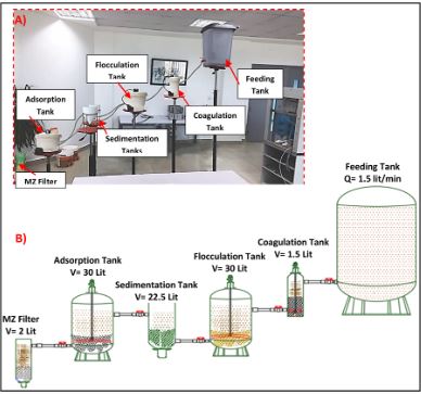This research investigates the feasibility of using hybrid treatment system based on coagulation/flocculation, adsorption and filtration processes for real textile wastewater treatment. Ferric Chloride (FeCl3) was used as a coagulant, Nano Zero-Valent Iron (nZVI) as adsorbent and Micro Zeolite (MZ) as filter media for the removal of chemical oxygen demand (COD), total suspended solids (TSS), color, total nitrogen (TN) and turbidity from raw textile effluents. Batch and continuous feed scaling-up studies (full design and set-up studies) were conducted to evaluate the performance of the