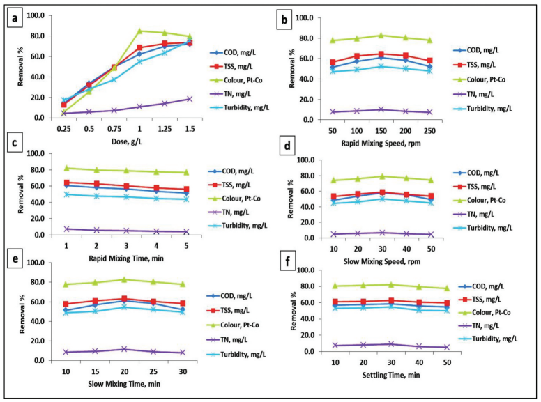 This study investigates the feasibility of applying coagulation/flocculation process for real textile wastewater treatment. Batch experiments were performed to detect the optimum performance of four different coagulants; Ferric Sulphate (Fe2(SO4)3), Aluminium Chloride (AlCl3), Aluminium Sulphate (Al2(SO4)3) and Ferric Chloride (FeCl3) at diverse ranges of pH (1–11) on the removal of chemical oxygen demand (COD), total suspended solids (TSS), colour, total nitrogen (TN) and turbidity from real textile wastewater. At pH 9, FeCl3 demonstrated the most effective removal for all studied
