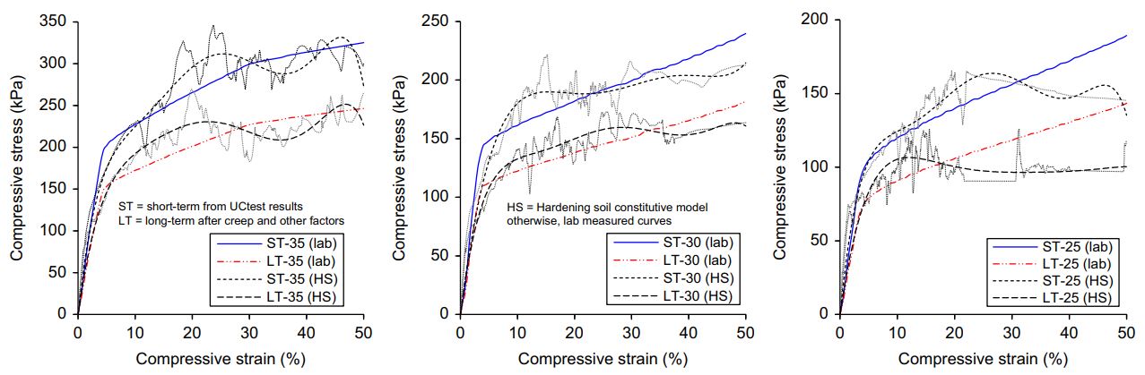 Expanded polystyrene (EPS) has long been used to reduce stresses acting on buried structures. In this study, the efficiency of utilising EPS in reducing vertical stresses acting on cut-and-cover tunnels was investigated. To gauge this, short- and long-term shear strength parameters of EPS with densities of 25, 30, and 35 kg/m3 were determined. Interface friction of EPS with various materials was measured considering the use of geotextile as a protective cover for EPS. Laboratory testing included unconfined compression, creep strain based on time-temperature-stress superposition, and modified