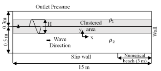 Submerged breakwaters are efficient structures used for shore protection. Many design features of these structures are captured upon modeling wave propagation over submerged square obstacles. The presence of separation vortices and large free surface deformations complicates the problem. A multiphase turbulent numerical model is developed using ANSYS commercial package. Careful domain discretization is done employing suitable mesh clustering to capture high gradients. Various numerical model parameters are provided, including grid size and time step. Special attention is directed towards