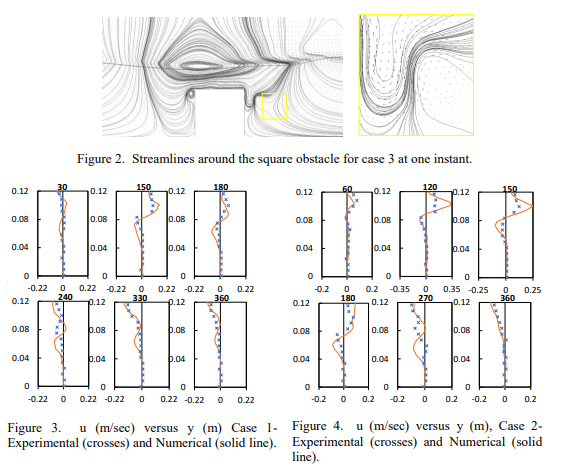 Modeling complex flow induced by water waves propagation over submerged square obstacles