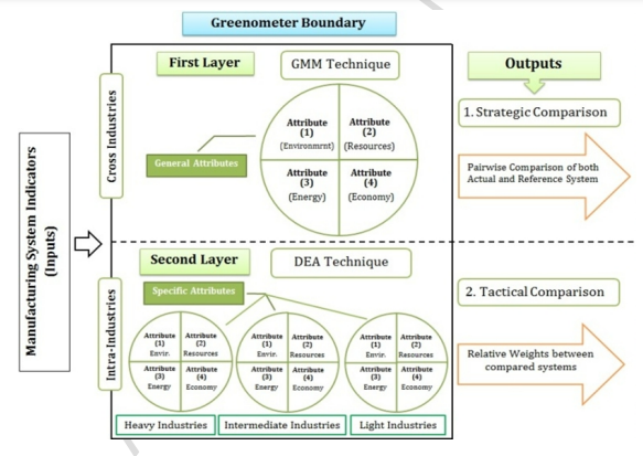 In this paper a toolbox (Greenometer) to assess the greenness level of manufacturing companies is proposed. The assessment approach is based on capturing the relative greenness position of any company among other industries from different sectors as well as within the same sector. The assessment was based on selected greenness attributes and their composing indicators at each of the two levels of the developed Greenometer. Geometric Mean Method (GMM) was adopted to be the generic assessment technique for cross industries greenness evaluation, while Data Envelopment Analysis (DEA) was employed