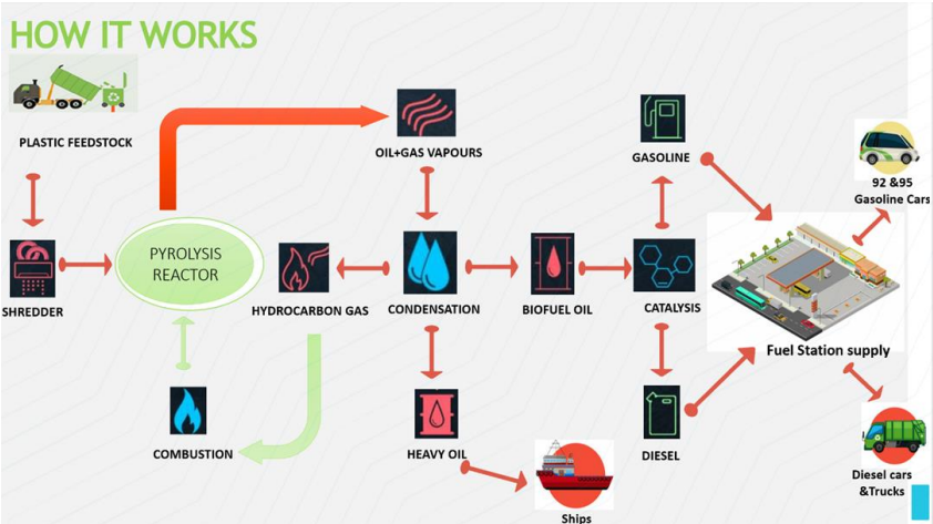 This paper aims to conduct a feasibility study of producing fuel from plastic waste. It is a suggested approach to deal with the huge production of synthetic plastic around the world, so as to avoid its accumulation in landfills and the depletion of resources. Several types of research have addressed the conversion of plastic waste into energy, and in this study the authors focused on using pyrolysis to convert plastic to liquid oil. Accordingly, the volume of the waste was reduced significantly, and the produced liquid oil had a high calorific value in comparison to fossil fuel. The authors