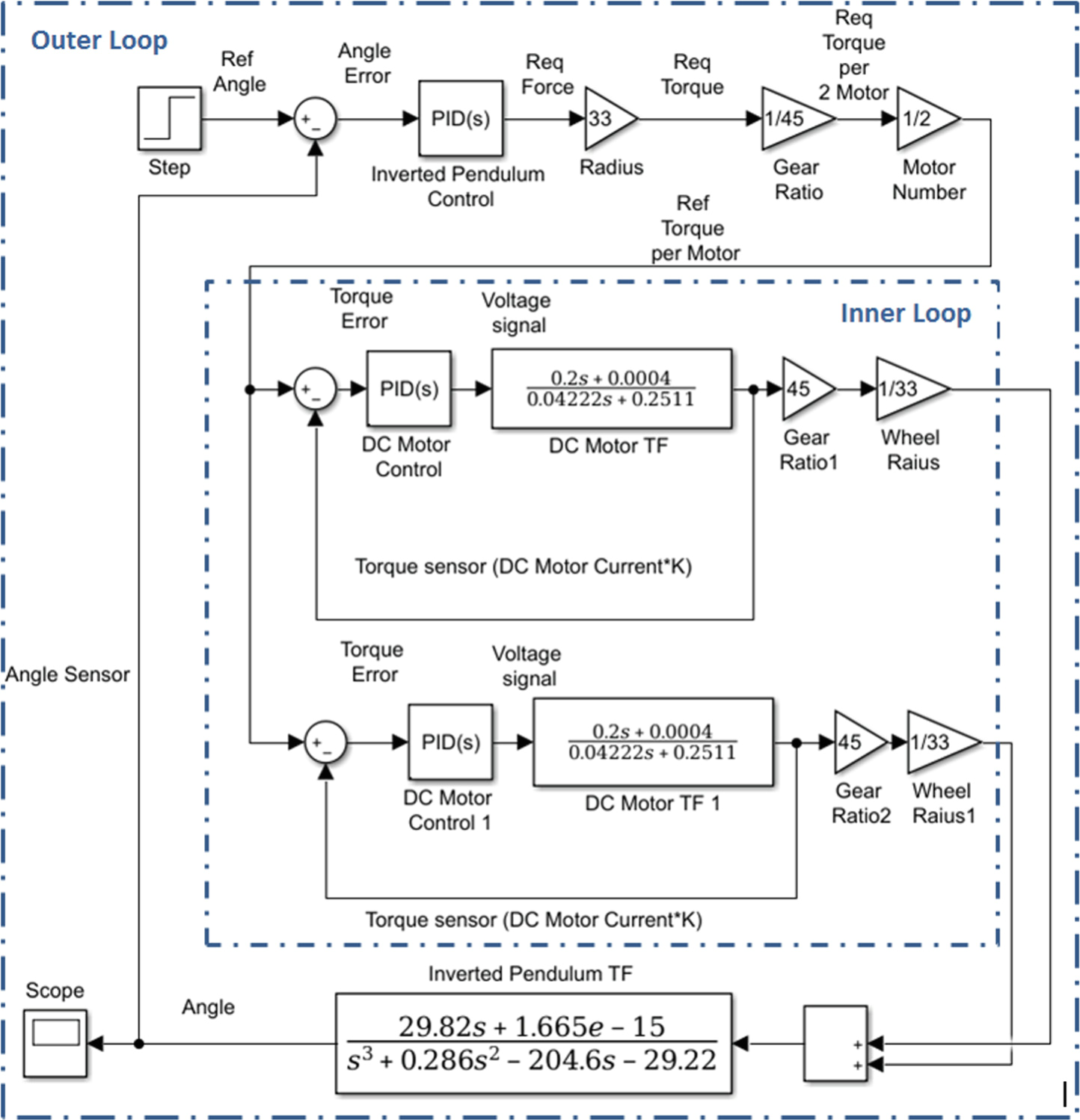 This paper represents the control of a two-wheel self-balancing robot based on the theory of controlling the inverted pendulum. This paper dividing the system modeling into two main parts. The first part is the dc motor and the second part are the whole mechanical design and its characteristics as a function in the motor speed and the torque depending on the system, creating two control closed loops inner and outer. The study uses conventional proportional–integral–derivative (PID) and two degree of freedom PID controllers to obtain a robust controller for the system. The inner loop controls