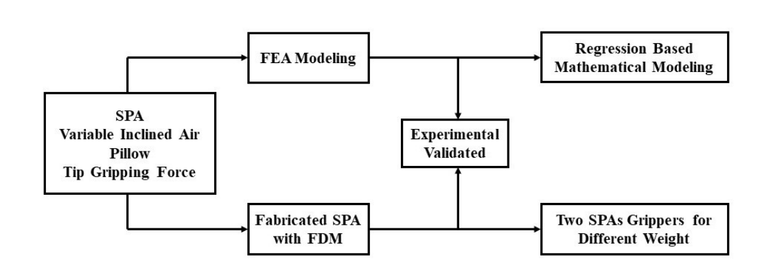 Soft pneumatic actuators grasping tasks is one of the essential rules in robot manipulation methods. The grasping forces can be adapted to handle delicate and hard objects without leaving any damages on the object surfaces. This paper investigates the influence of the inclination angle of the soft pneumatic actuator (SPA) on its gripping force at its end tip. A range of inclination angles for SPA is analyzed using Finite Element Analysis (FEA) to estimate the gripping force at the end tip regarding SPA inner faces pressure. FEA study is conducted based on Hyperelastic material modeling
