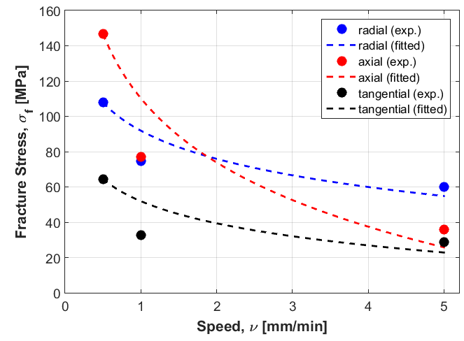 The mechanical properties of bone tissues change significantly within the bone body, since it is considered as a heterogeneous material. The characterization of bone mechanical properties is necessary for many studies, such as in prosthesis design. An experimental uniaxial compression study is carried out in this work on bovine cortical bone tissue in long bones (femur and tibia) at several speeds to characterize its anisotropic behavior. Several samples from different regions are taken, and the result selection is carried out considering the worst situations and failure modes. When