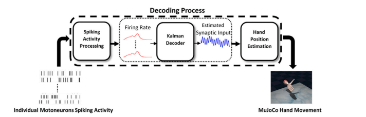 Up to 50% of amputees abandon their prostheses, partly due to rapid degradation of the control systems, which require frequent recalibration. The goal of this study was to develop a Kalman filter-based approach to decoding motoneuron activity to identify movement kinematics and thereby provide stable, long-term, accurate, real-time decoding. The Kalman filter-based decoder was examined via biologically varied datasets generated from a high-fidelity computational model of the spinal motoneuron pool. The estimated movement kinematics controlled a simulated MuJoCo prosthetic hand. This clear-box
