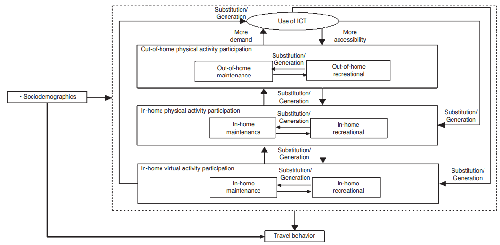 The boom in telecommunications is expected to have many impacts on peoples' activities and travel behavior. Recent advances in information and communication technologies (ICTs) make it possible to conduct activities virtually. Thus the need for physical travel for some types of activities is obviated. Accordingly, the use of ICT may contribute to reducing urban congestion and alleviating air quality problems. However, ICT may generate significant additional travel because of the increased connectivity and access to resources. Empirical insights on how the growing use of ICT affects travel