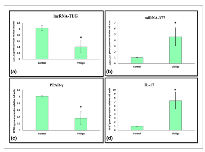 Background: Taurine-upregulated gene 1 (TUG1) is one of the long noncoding RNAs (lncRNAs) that plays a role in melanogenesis. MicroRNA-377 (miRNA-377) is a conserved noncoding RNA that regulates angiogenesis and promotes oxidative stress. Peroxisome proliferator-activated receptors (PPARs) are components of the nuclear hormone receptor superfamily. PPAR-γ activators stimulate melanogenesis. Interleukin (IL)-17 has been implicated in the pathogenesis of several immunological diseases. This work aimed at detecting the expression levels of lncRNA TUG1, miRNA-377, PPAR-γ, and IL-17 among vitiligo